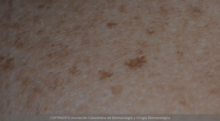 Son manchas color café o marrón, ovaladas, que aparecen en personas mayores en sitios que se exponen a la luz solar como la cara, los brazos y las manos. Son benignas, lisas, de contornos irregulares, bien definidos y están asociadas con la exposición al sol sin protección. Corresponden a un aumento en la producción de las células que producen el pigmento de la piel (melanocitos). Suelen medir entre 1 y 3 centímetros, crecen con lentitud y en ocasiones pueden ser múltiples. Estas lesiones son benignas, sin embargo cuando se aprecien cambios en su forma o coloración, produzcan molestias (picor intenso, dolor), crezcan rápidamente, cambien de color a negro intenso o rojo, se ulceren o sangren de forma espontánea se debe consultar al dermatólogo.