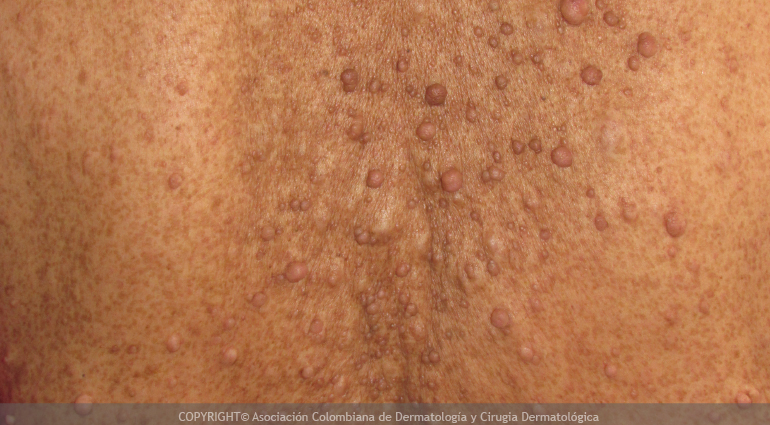 Los neurofibromas que se originan en la piel se presentan como pápulas (elevación menor de 0.5cm) o nódulos (elevación mayor de 0,5cm) que se observan como masas protuberantes o pedunculadas, color piel, más suaves que el tejido que los rodea, usualmente asintomáticos, aunque en ocasiones pueden presentan escozor.