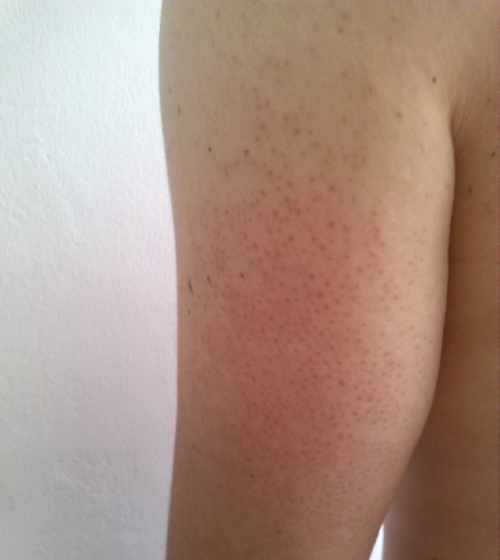 Se caracteriza por la presencia de pápulas (pepitas) que aparecen alrededor de los foliculos pilosos (vellos), contienen queratina (escama) y estan rodeados de un borde rojizo. Se localizan en cara lateral de brazos, muslos, glúteos, y al tacto dan una senscion áspera que semeja un lija. Puede comprometer la cara y en casos más raros hay compromiso de cejas causando su perdida.