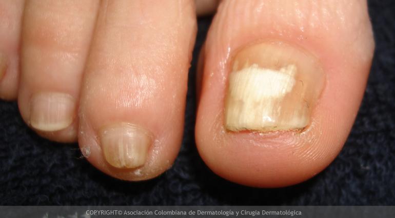 La onicomicosis subungueal distal es la más común, inicia con color blanquecino a pardo amarillento en la parte distal de la uña, más cerca al borde libre, se observa engrosamiento de la uña y despegamiento de la misma.